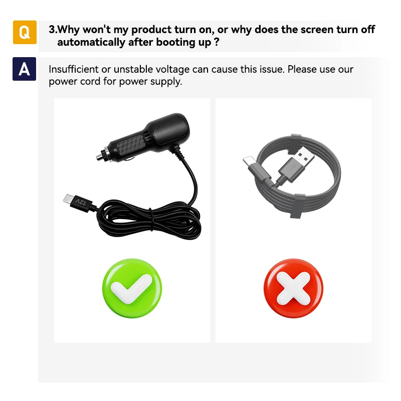 3.CarPlay's power supply is strictly limited to approximately 12V. Voltage instability may cause frequent reboots or permanent damage to the head unit.