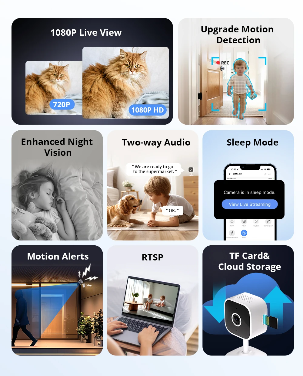 【Local & Cloud Storage】You can choose to save videos with cloud storage through the Camera Plan (sold separately) or save them locally using a TF card (sold separately).