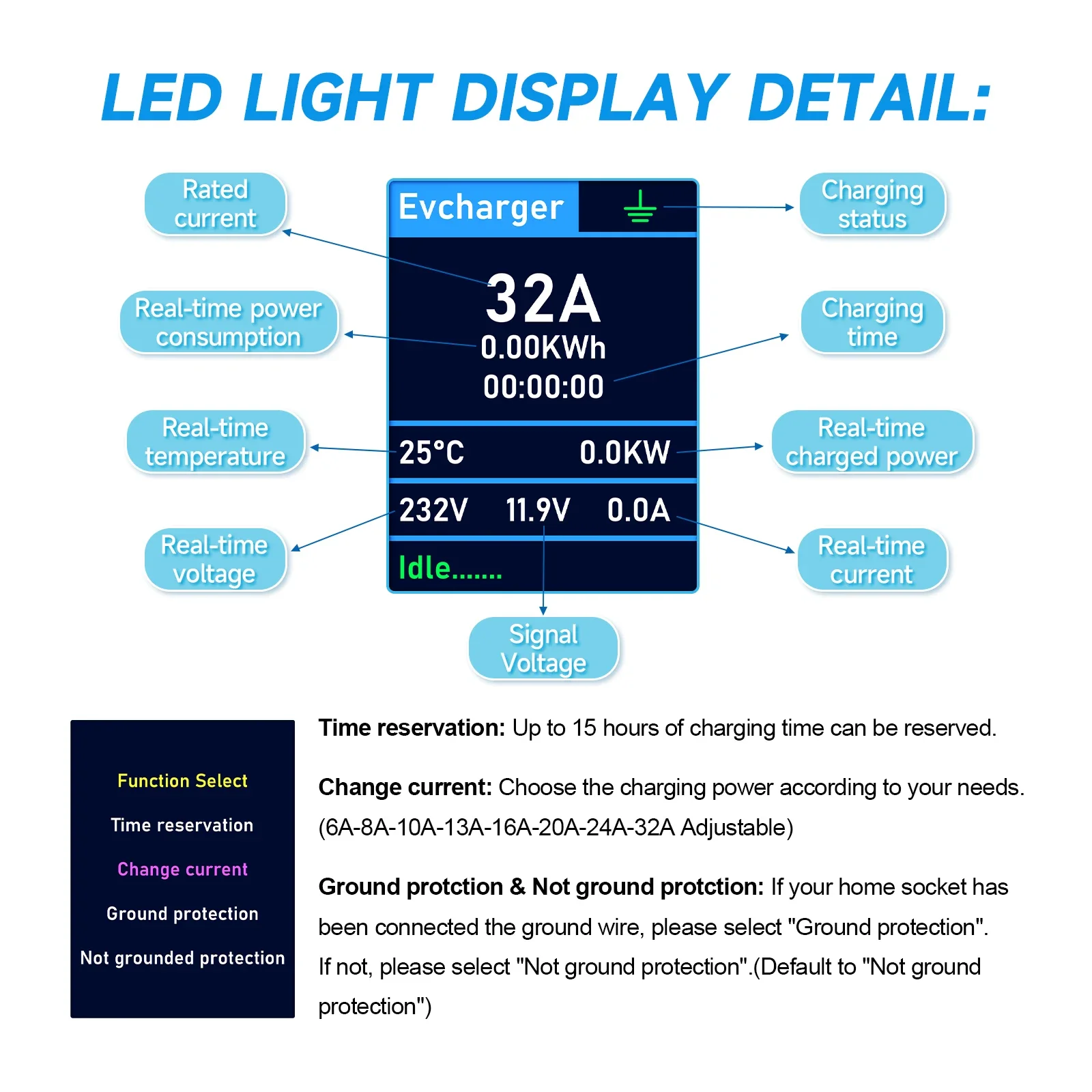 WiFi Smart APP Control: Built-in smart APP, which allows your vehicles to be charged during off-peak period by setting the charging time, save money on the electricity bills. And it allows to adjust charging current range from 6A to 32A, fully-charged notification or track the charging status.