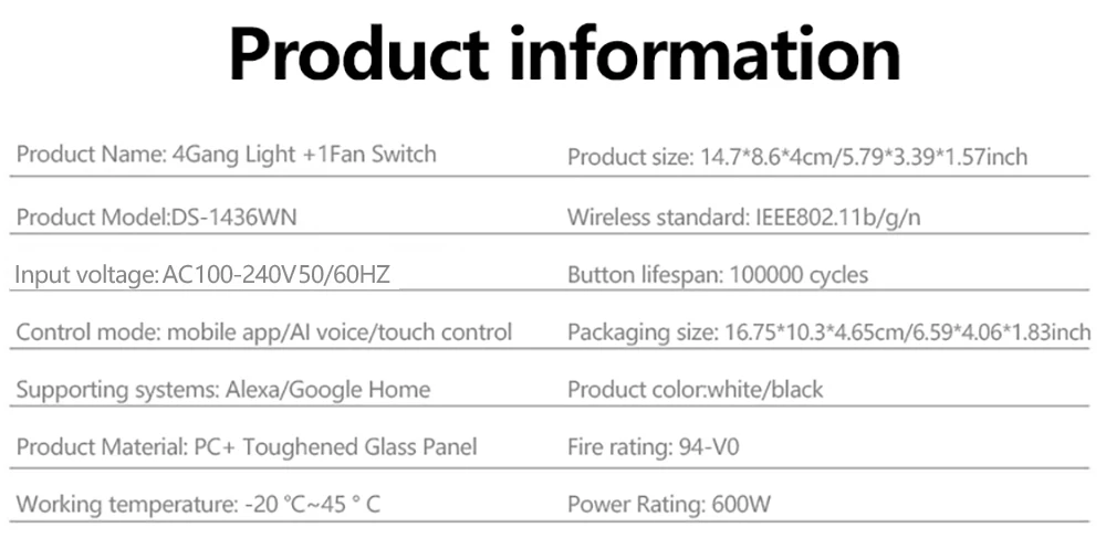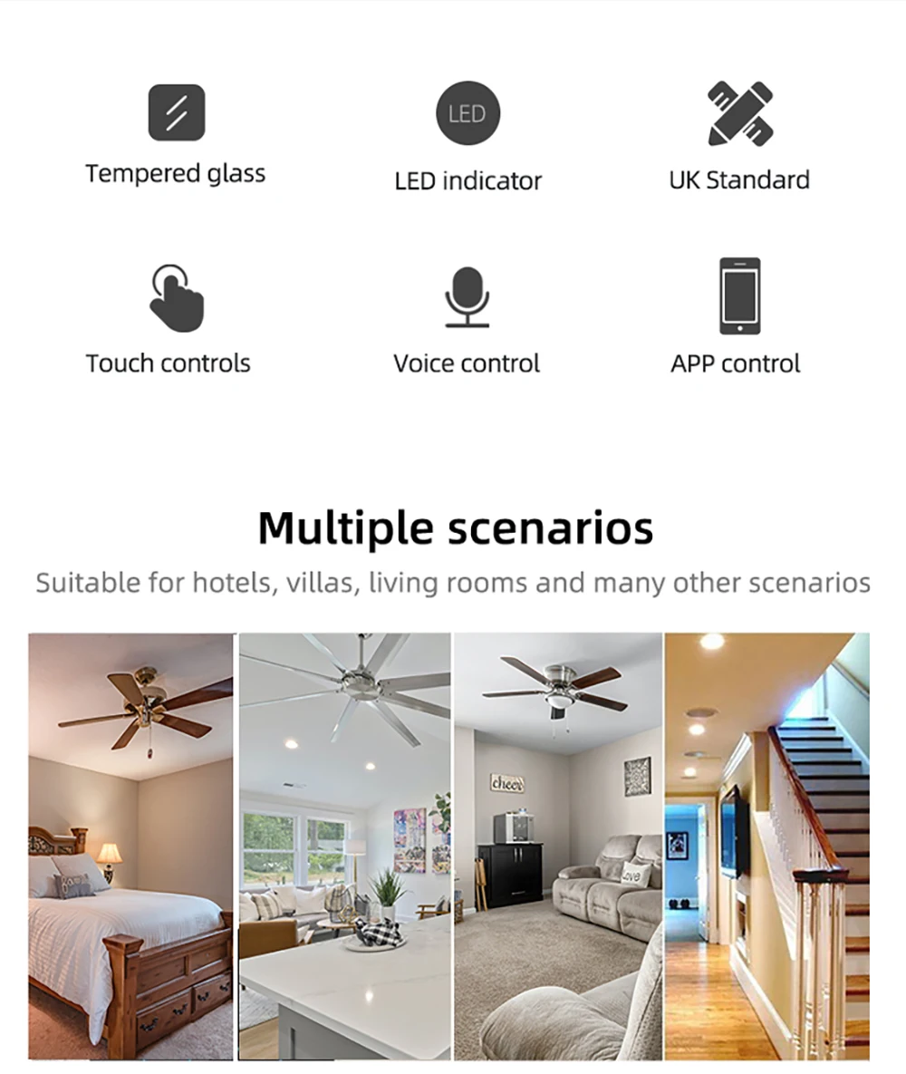 6.SMART FAN SWITCH:This smart dimmer fault switch supports stepless dimming for lighting or adjustable ceiling fan speed, 4 dimming options, APP remote control, timing adjustment, special overload protection design a security in the household.