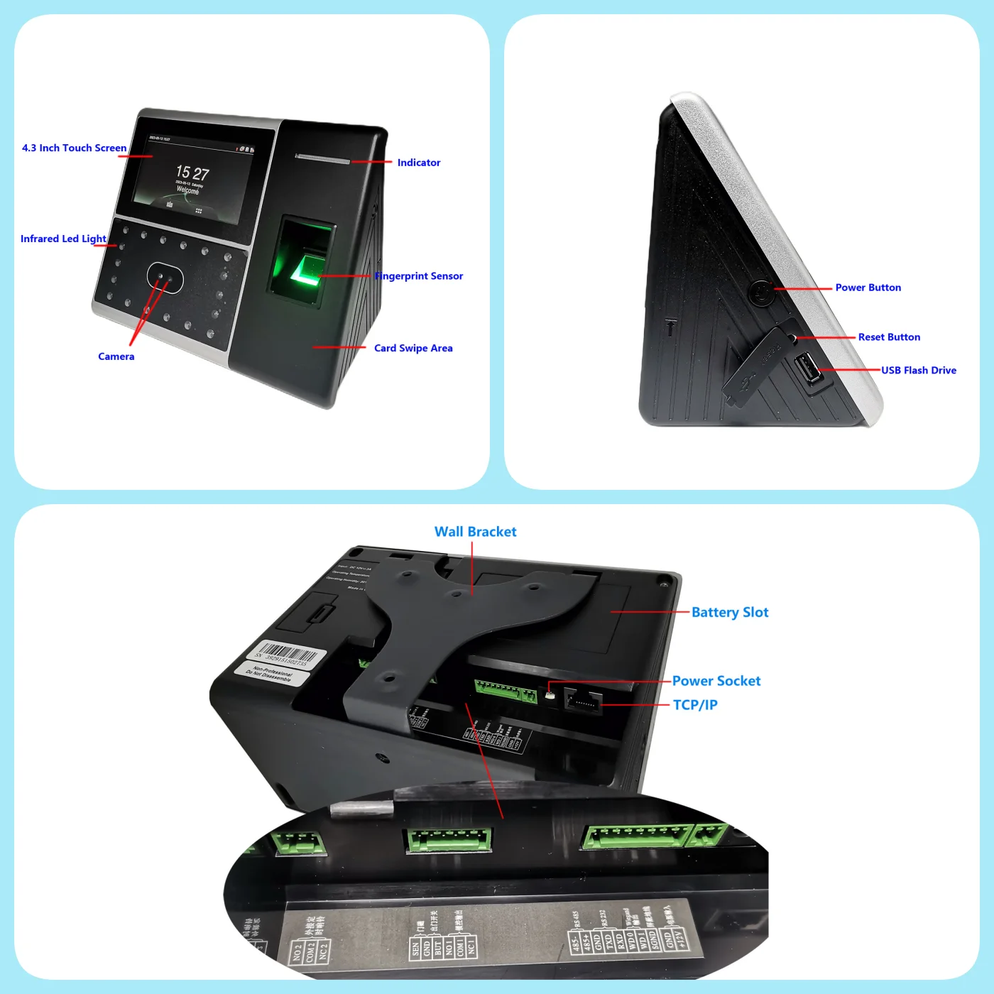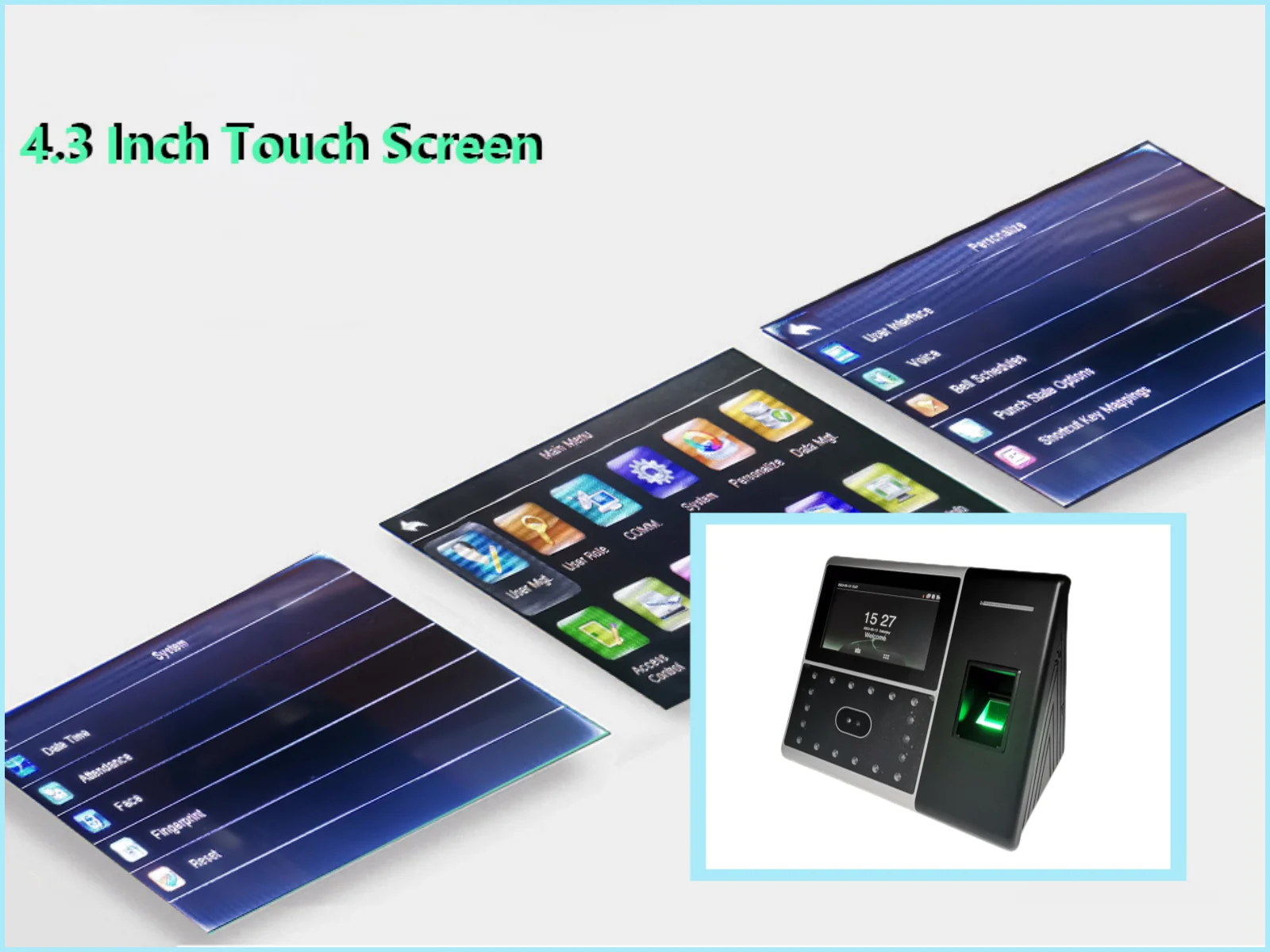 Time attendance Standard functions:Automatic Status Switch, Self-Service Query, Work Code, T9 input, 9 digit user ID, Photo-ID, Scheduled-bell. 2000mAh backup battery